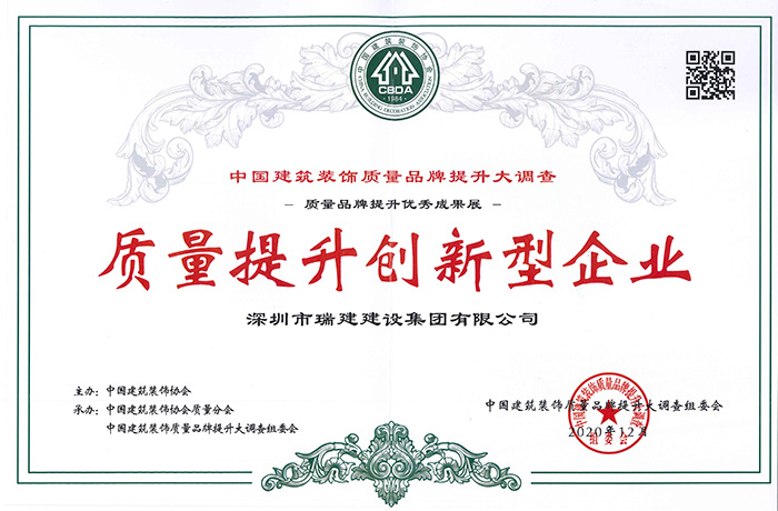 为打造质量品牌新优势,提高企业核心竞争力,加快推进我国建筑装饰行业转型升级高质量发展,由中国建筑装饰协会组织的“中国建筑装饰质量品牌提升大调查”活动中,瑞建集团被评为“质量提升创新型企业”称号。