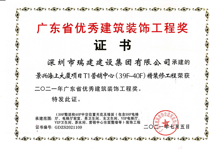 此次工程荣获“2021年广东省优秀建筑装饰工程奖”,是对瑞建集团在工程质量、专业技术、施工工艺等方面的肯定。今后,瑞建集团将继续抓好工程质量,不断总结创优经验,努力提供更多更好的精品工程。